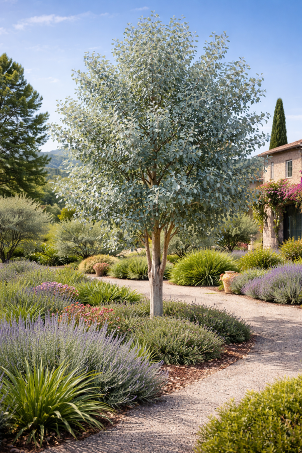 A kék eukaliptusz kiváló választás szoliter faként, mediterrán hangulatú kertekben vagy modern tájépítészeti kompozíciókban, ahol különleges lombszíne igazán érvényesül.
